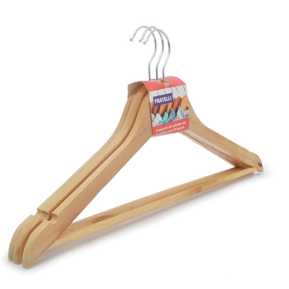 Organize seu closet com estilo! O Cabide 3 peças de madeira é robusto, durável e elegante, ideal para manter suas roupas sempre bem cuidadas e em destaque.