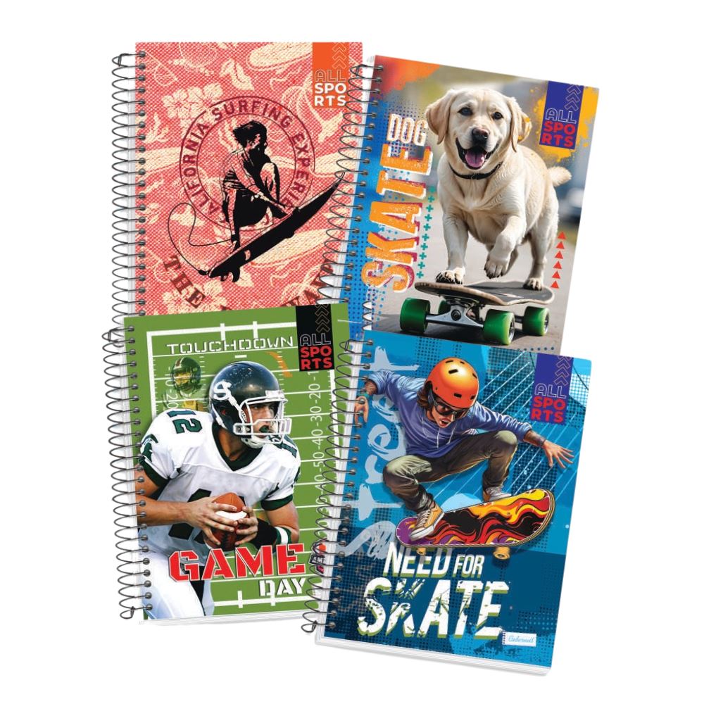 Caderno Uni All Sports 12x1 com 240 folhas. Inclui 4 unidades. Ideal para anotações e tarefas, une praticidade e estilo esportivo em um só produto!