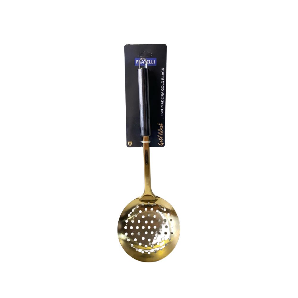 Escumadeira Gold Black 36 cm: eficiência e estilo na cozinha. Design elegante e durabilidade. Ideal para servir com sofisticação suas receitas.