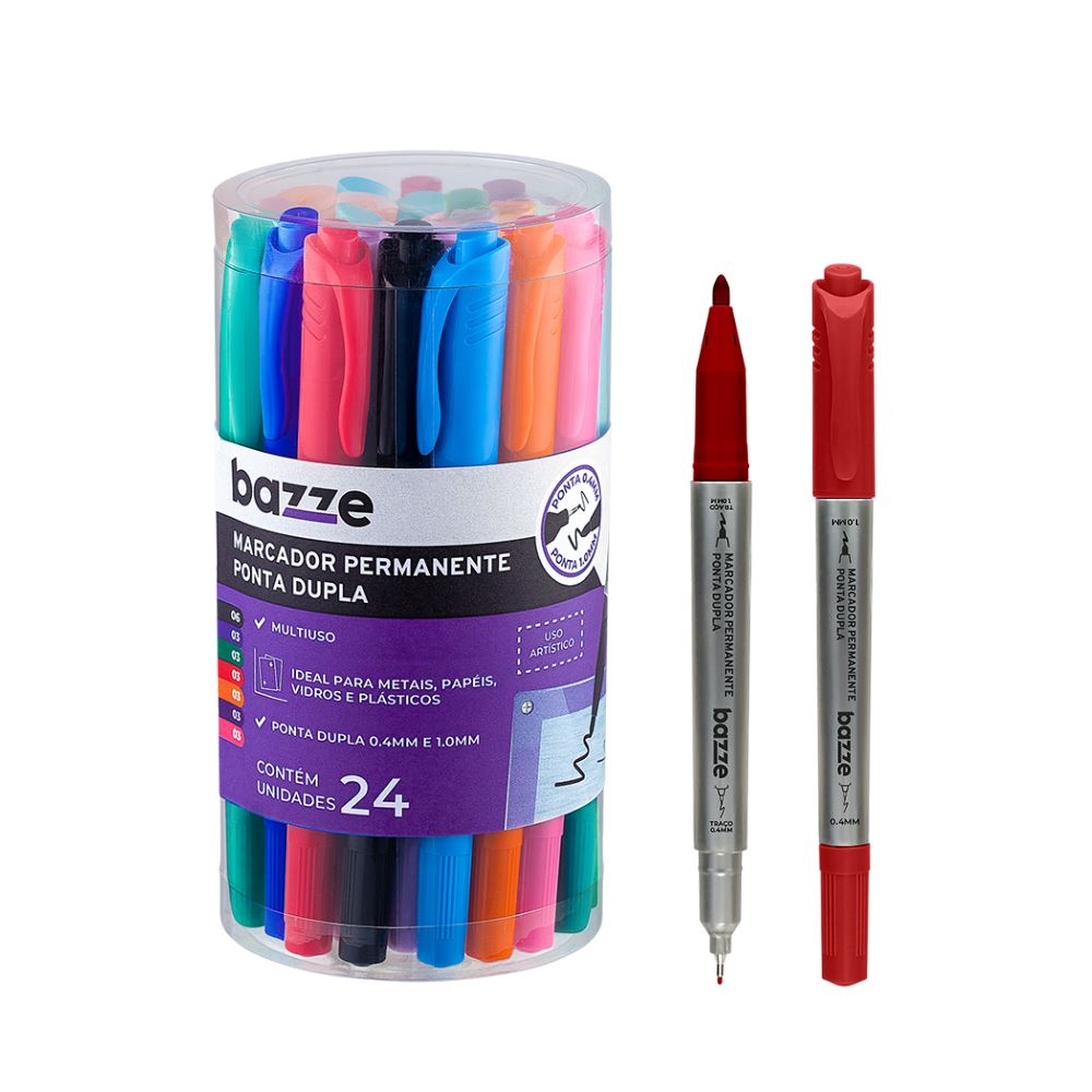 O Pote de Marcador Perm Ponta Dupla Bazze é ideal para traços precisos e amplos, com tinta vibrante e durável. Perfeito para artistas e estudantes!